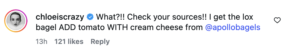 However, Chloe came to correct the record in an Instagram comment! My sincerest apologies, Chloe! A lox bagel with tomato and cream cheese is, in fact, her bagel order. This has more of the joie de vivre I was looking for and it bumps her up into the #6 spot.